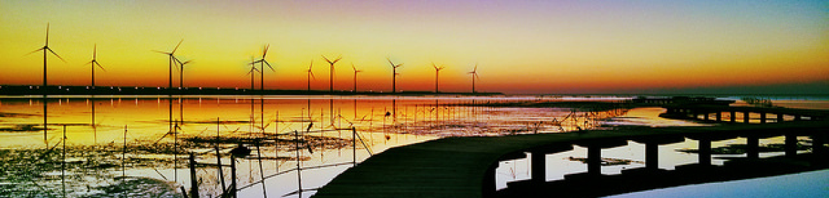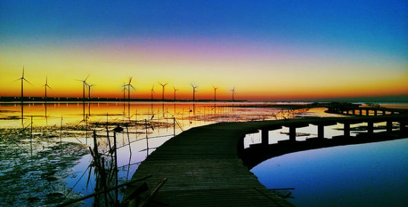 台中から北西へ約20km、大甲溪の河口に広がるおよそ1500ヘクタールの高美湿地は、 天気など条件が重なると周りの風景を鏡面のように反射させることから、 「台湾のウユニ塩湖」と呼ばれ近年注目を集めている。湿地には100種以上の鳥が生息しており、 バードウォッチングを楽しんでいる人も多い。 周辺には海から吹き付ける風を利用した風力発電の施設が立ち、 人工物と自然の景色が融合して独特の景観をつくり出している。まだまだ穴場のスポットです。